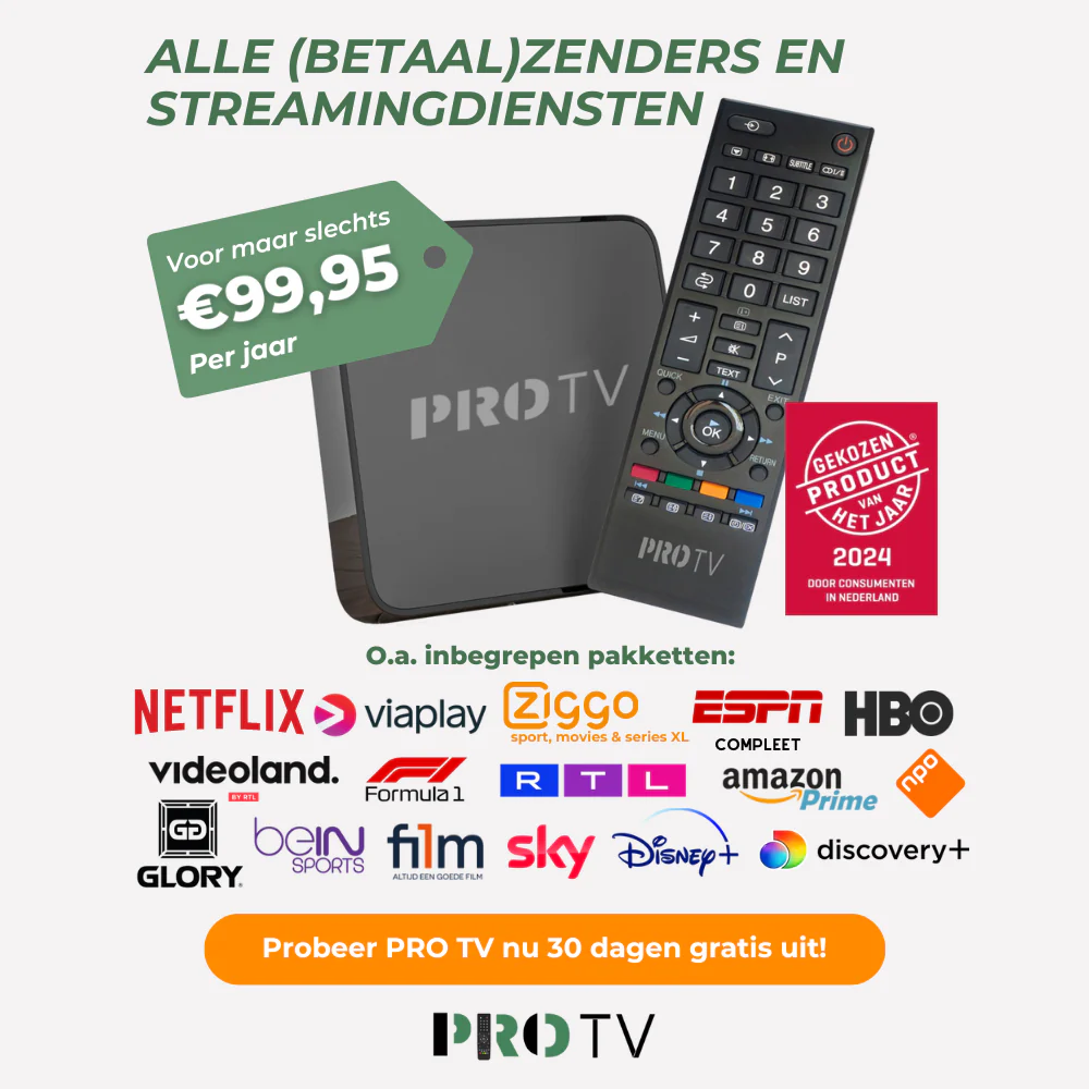 De Pro-TV-box biedt toegang tot alle reguliere én betaalzenders, inclusief HBO, Netflix, Videoland, Disney+, Ziggo (sport, movies & series XL), Viaplay (Formule 1), Film1, HBO, Netflix, Videoland, Disney+, en meer. Dit alles is beschikbaar voor slechts € 99,95 per jaar, waarmee je jaarlijks honderden euro’s bespaart!
